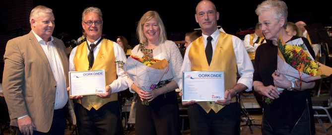 Tijdens het nieuwjaarsconcert/borrel op 6 januari in De Phoenix heeft muziekvereniging Concordia Anton van Boekel en Appie Zwaans gehuldigd vanwege hun 50-jarig lidmaatschap van de vereniging. Een mooie gelegenheid om beide heren met hun partners in het zonnetje te zetten. (foto: Rian van Griensven)